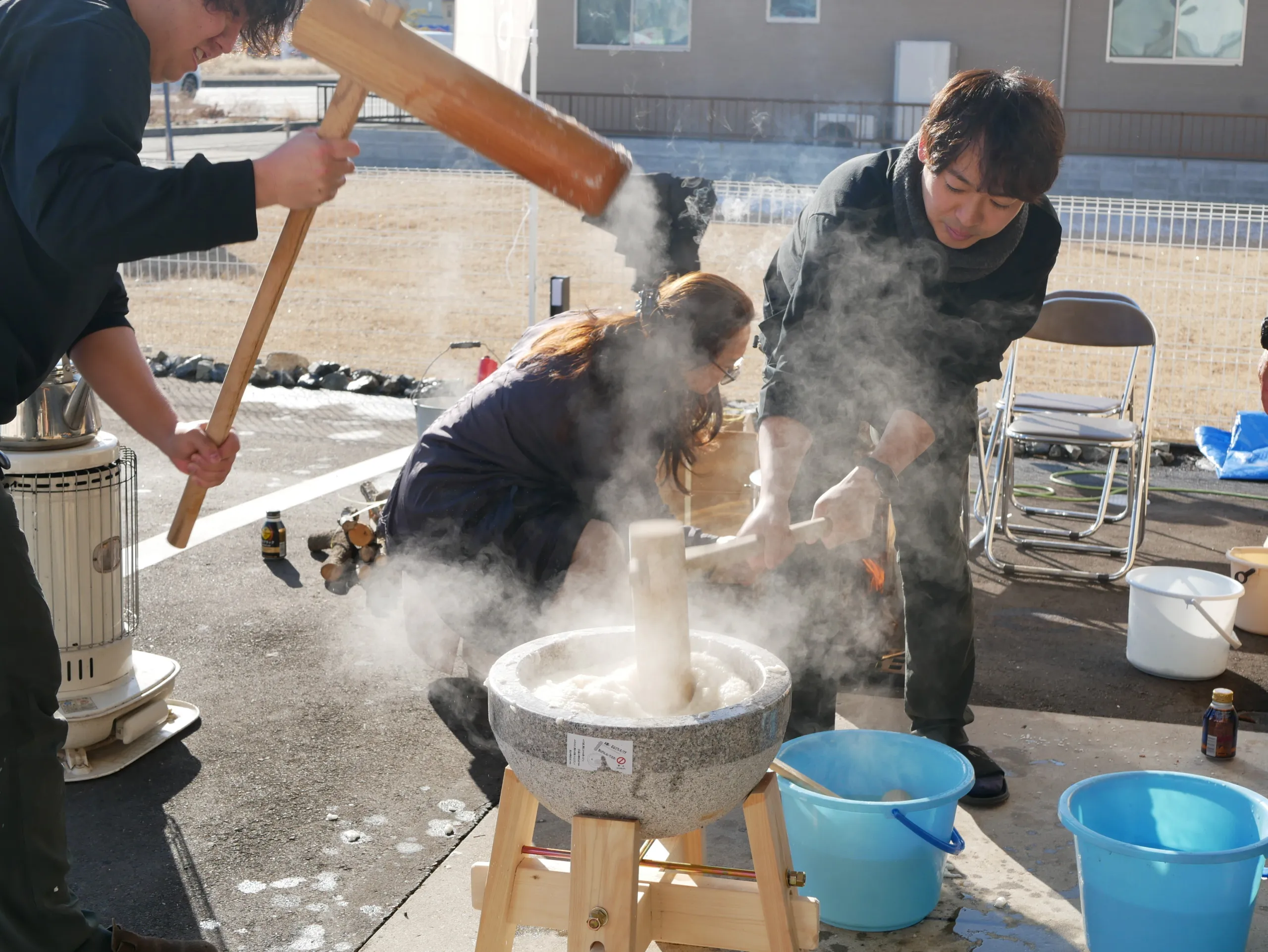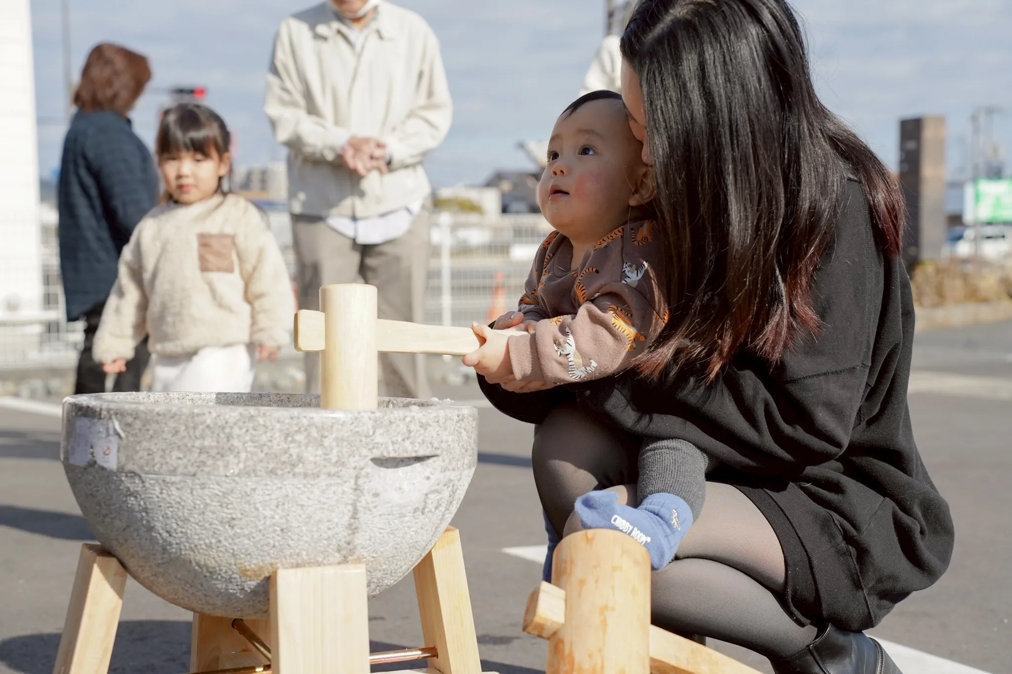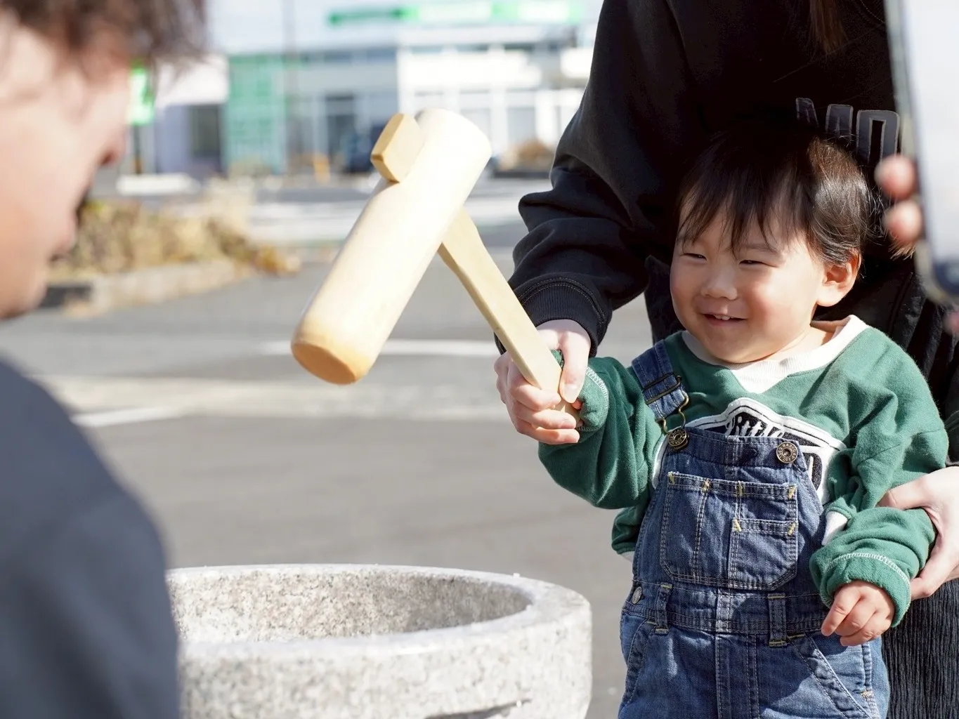 今回はお子様用のおもちつきも用意し、小さな手で一生懸命おもちをつく姿に、周りの大人たちも自然と笑顔に。