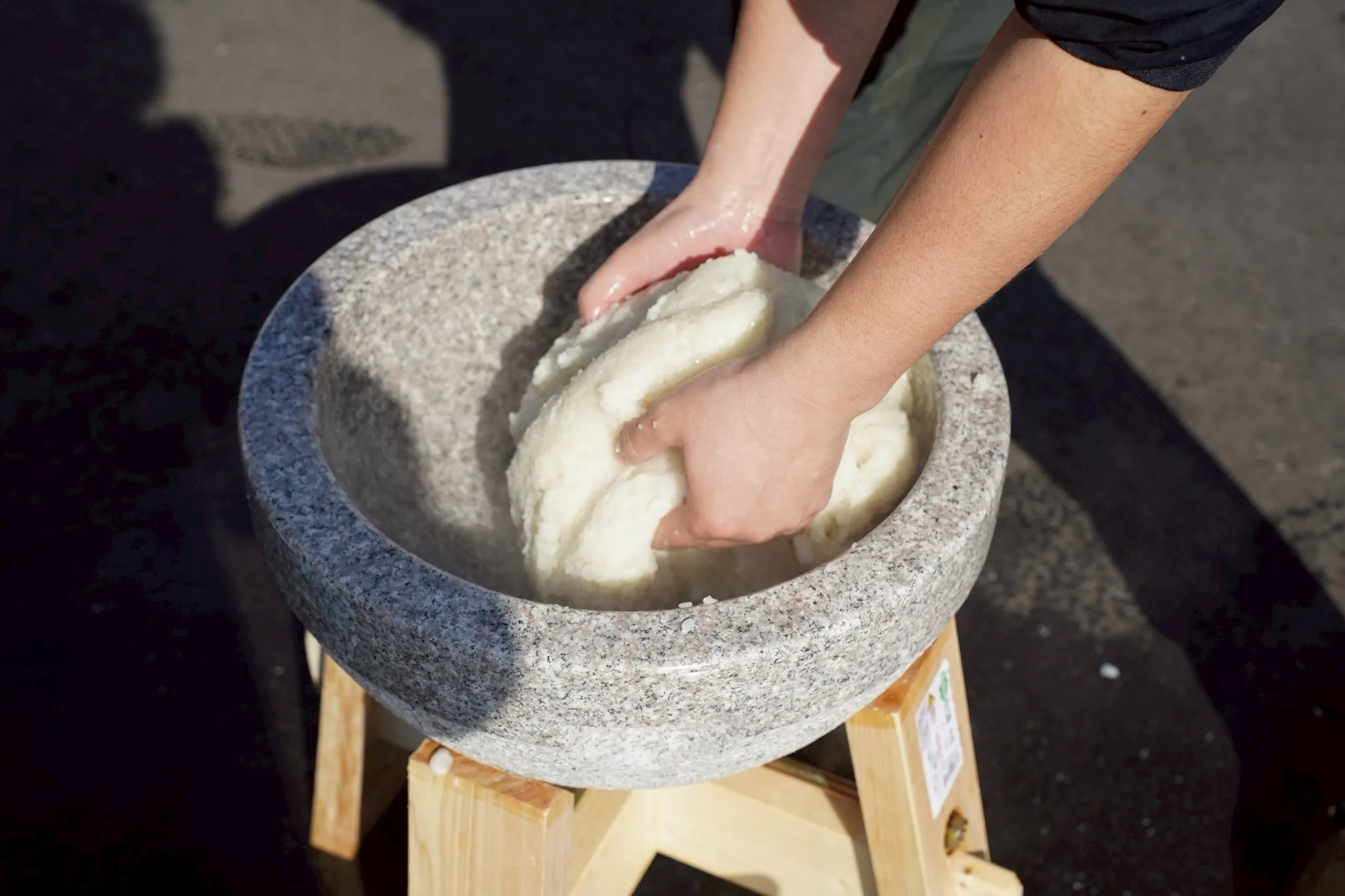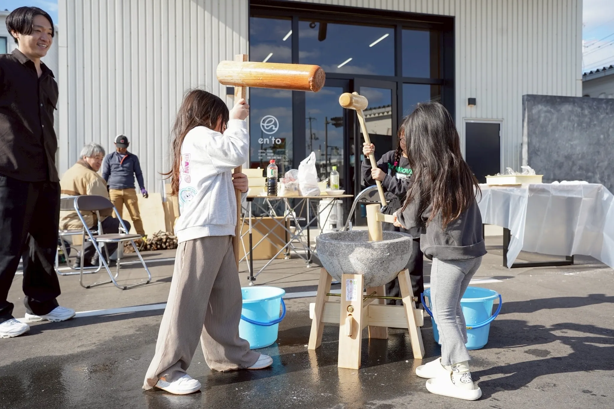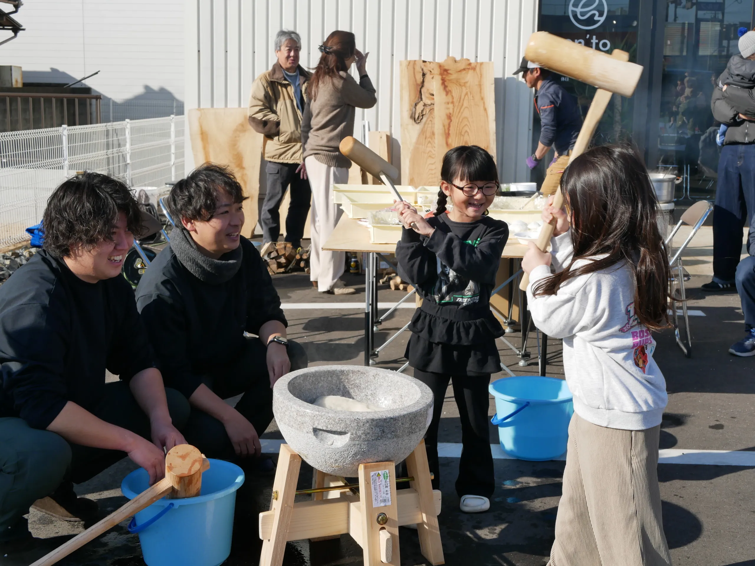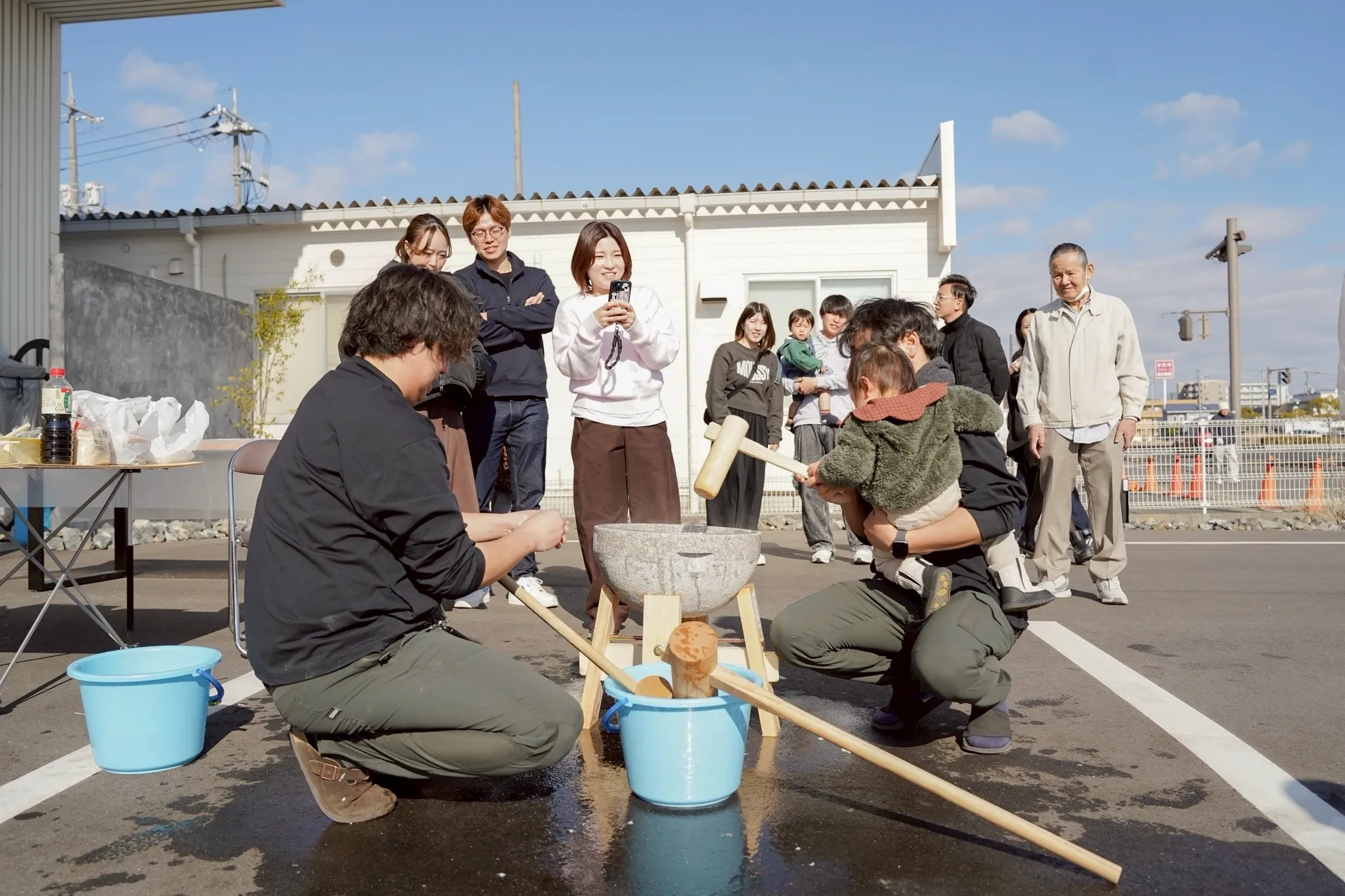今回はお子様用のおもちつきも用意し、小さな手で一生懸命おもちをつく姿に、周りの大人たちも自然と笑顔に。