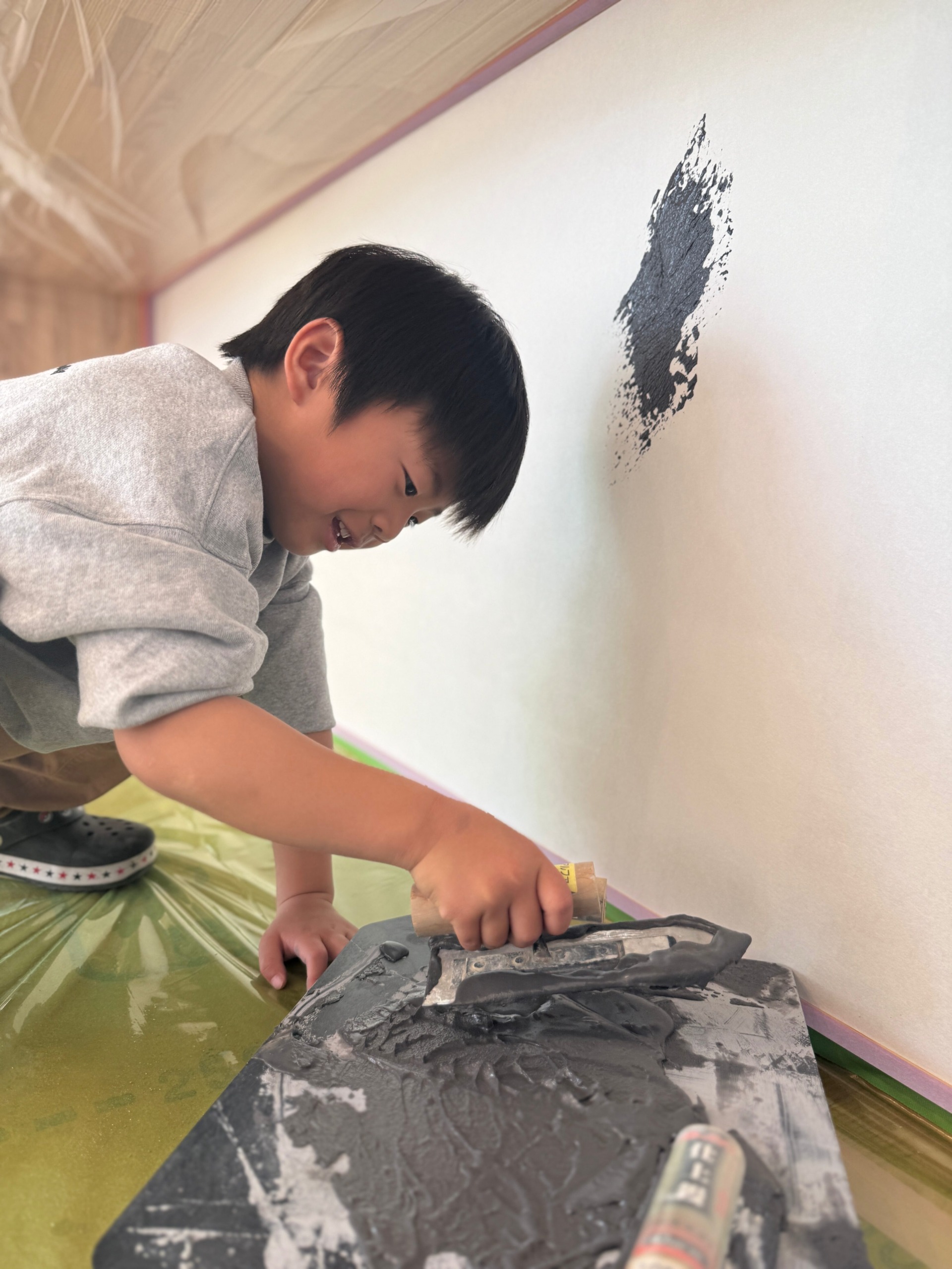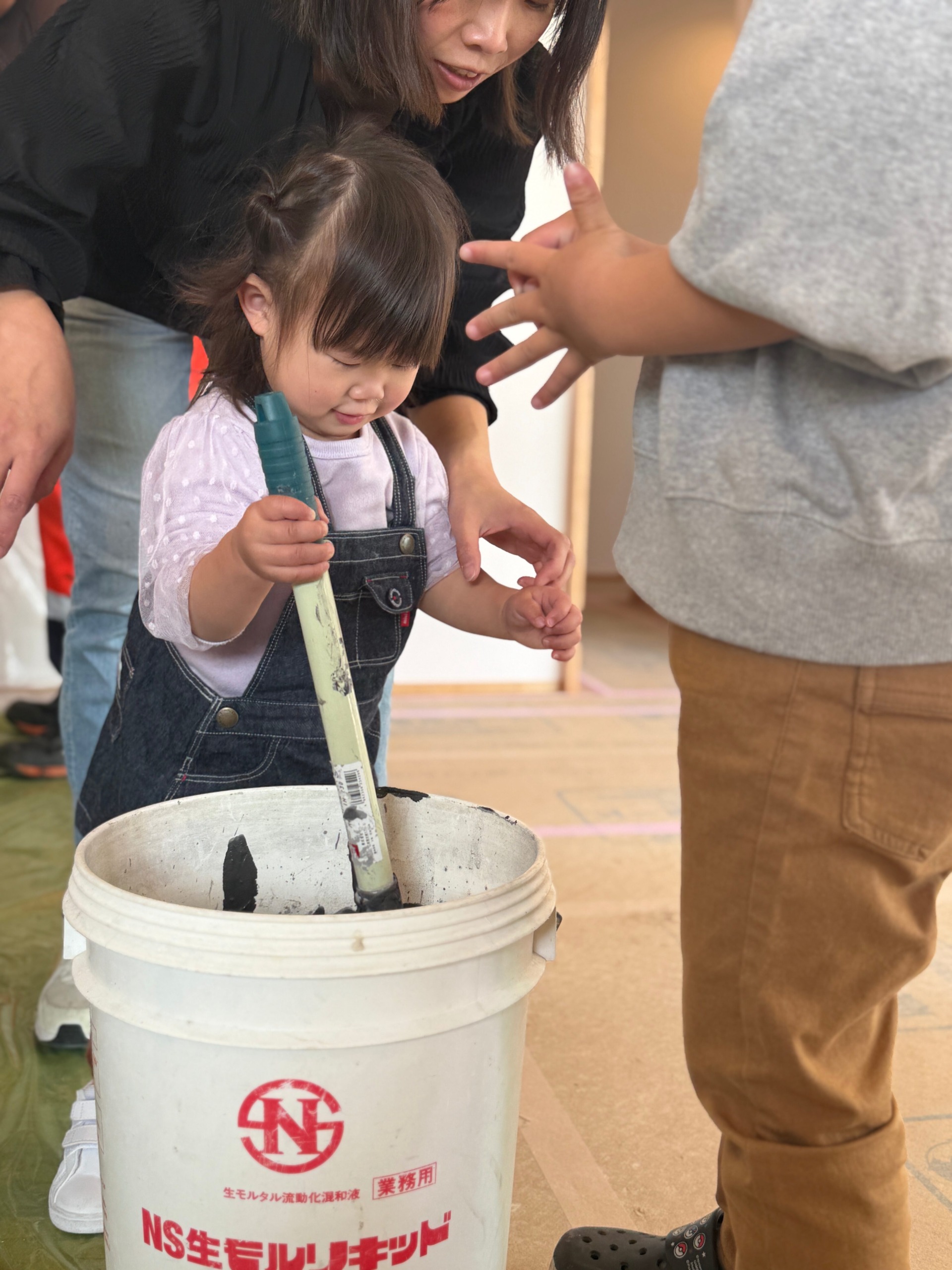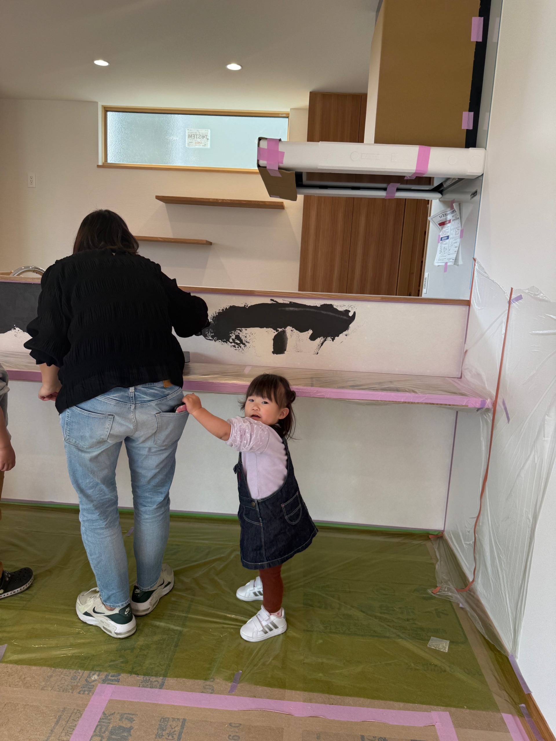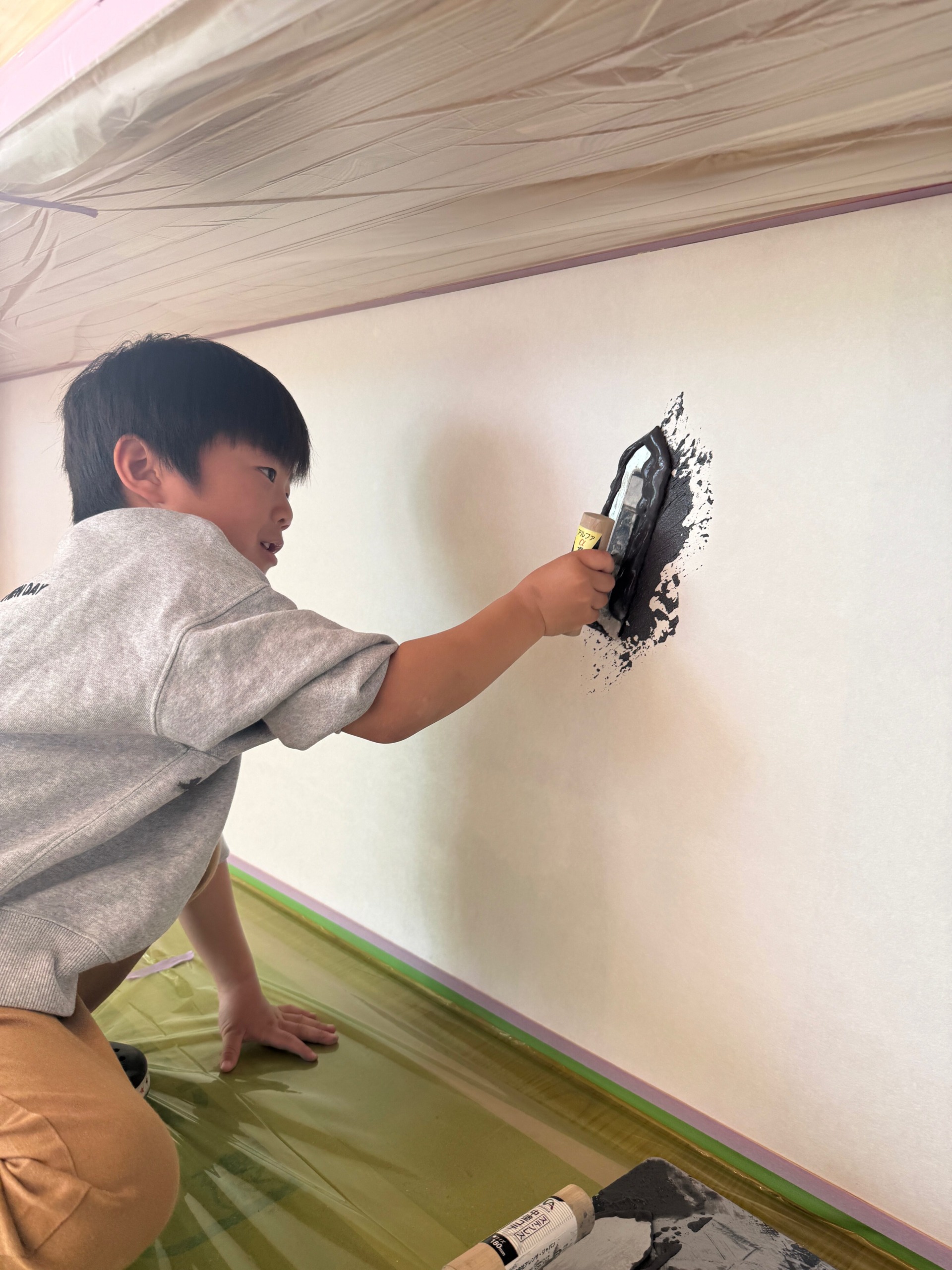 N様ご家族は、これまでの工作室イベントでも漆喰塗りを体験されていますが、今回はキッチンの大きな壁を前にお子様も興味津々♩