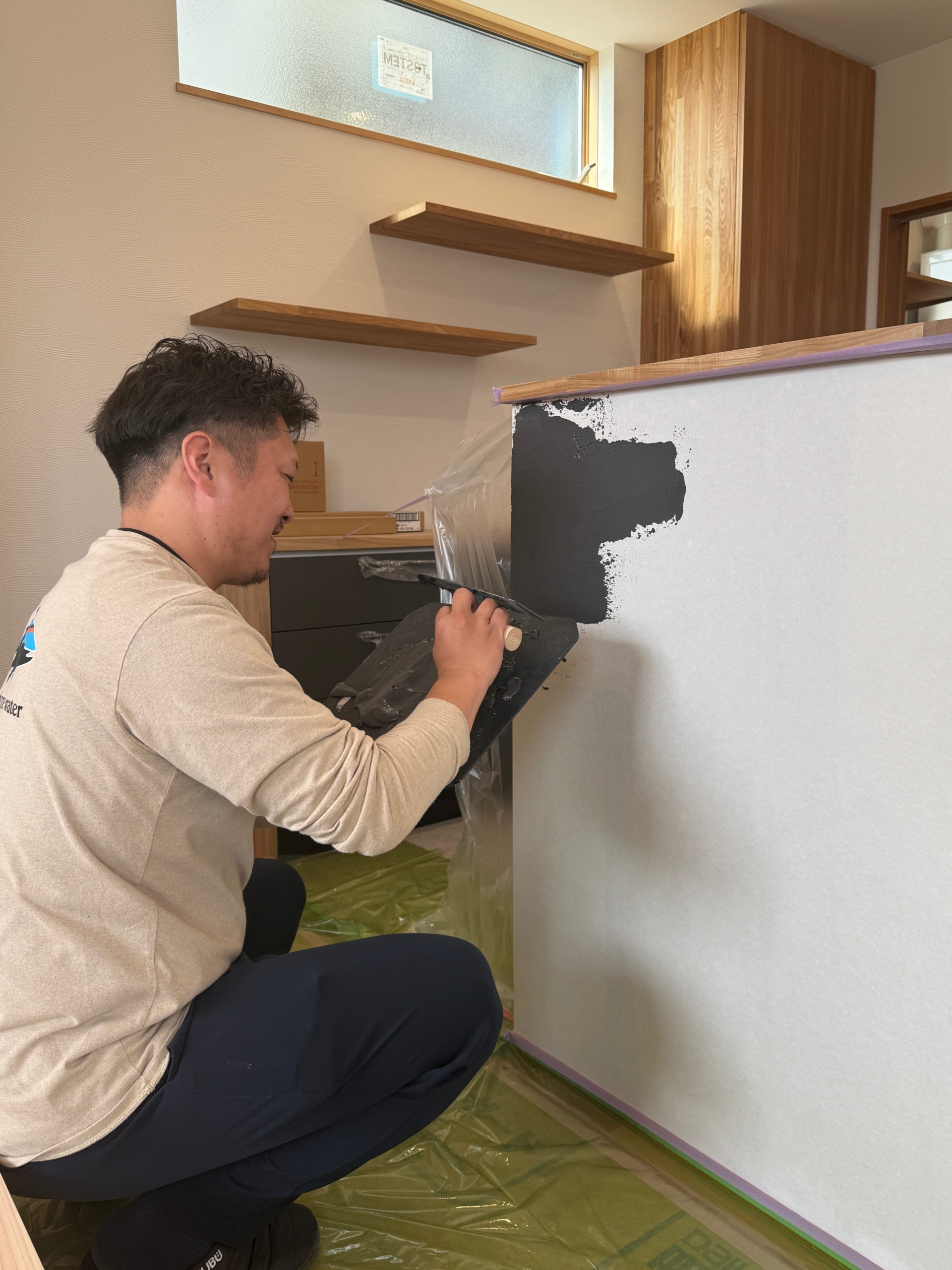 先日、N様邸にてキッチン壁の漆喰塗りをおこないました!