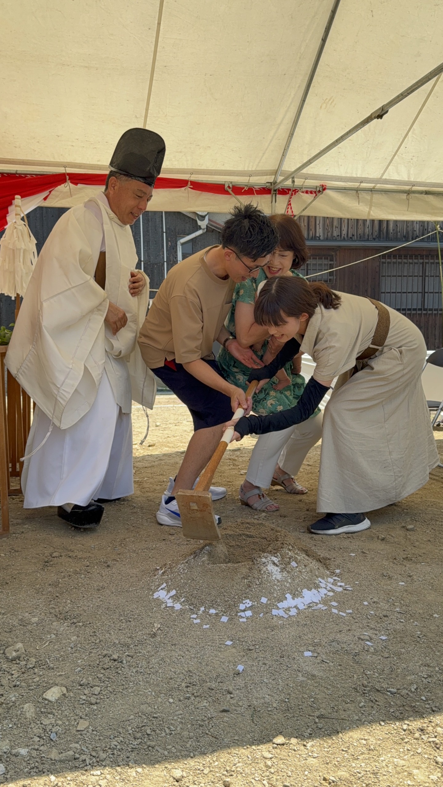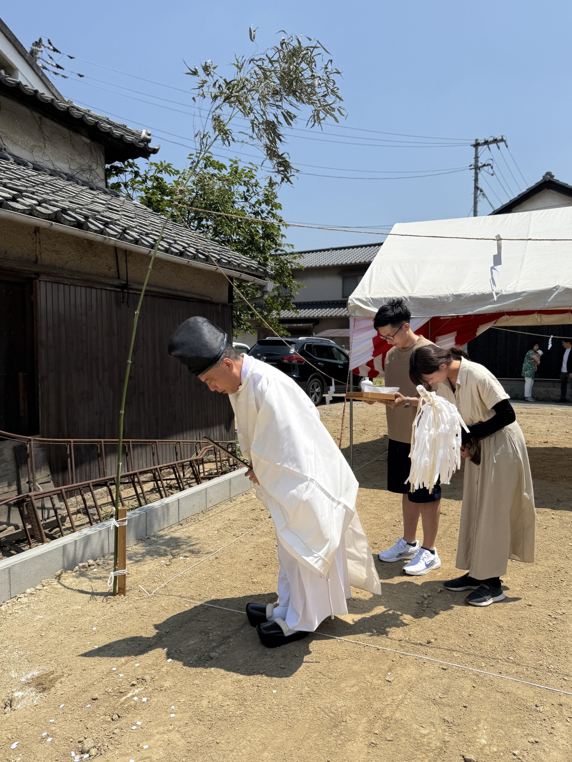暑さの中で行われた地鎮祭は、ご家族の笑顔と力強い声が印象的な一日でした。
