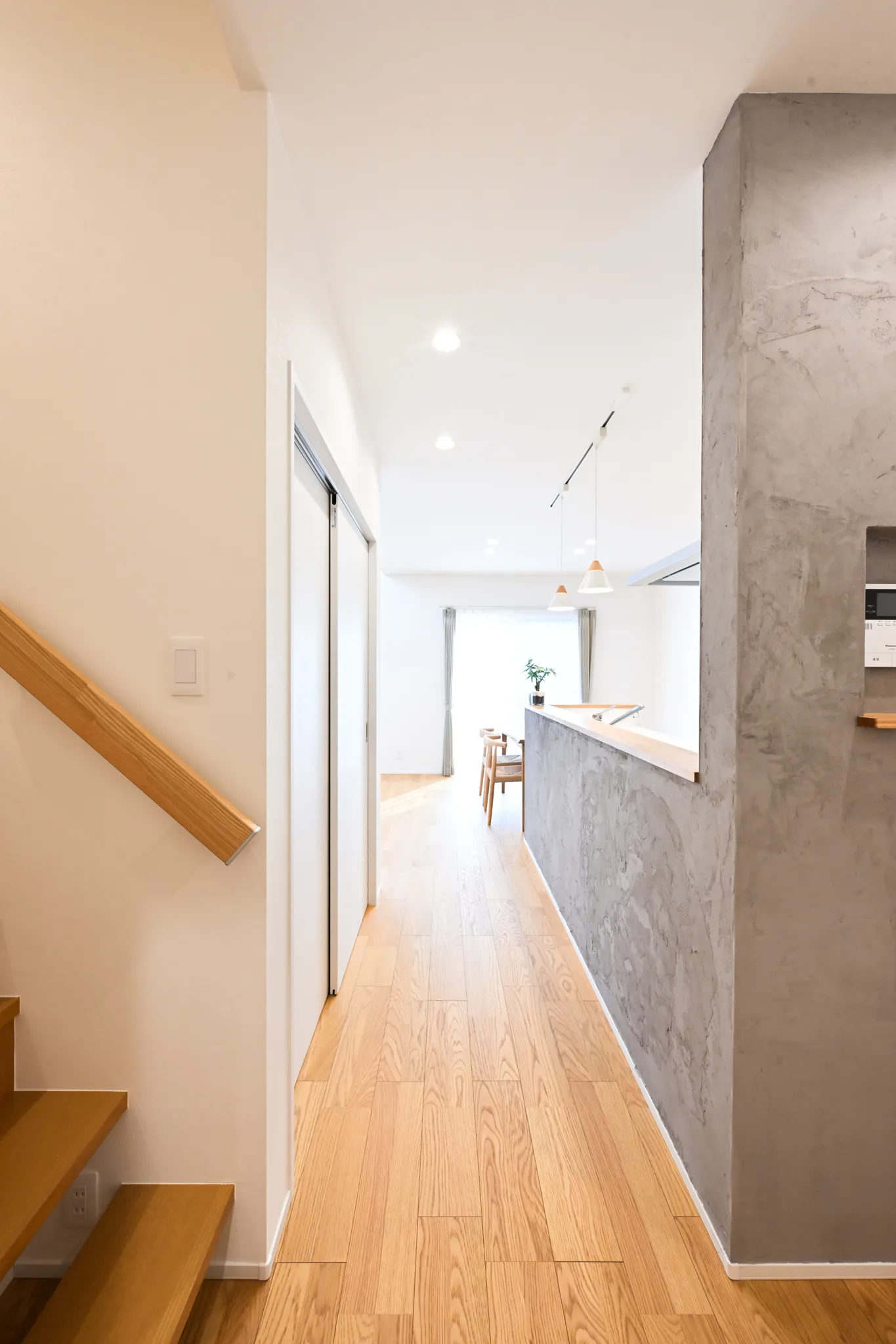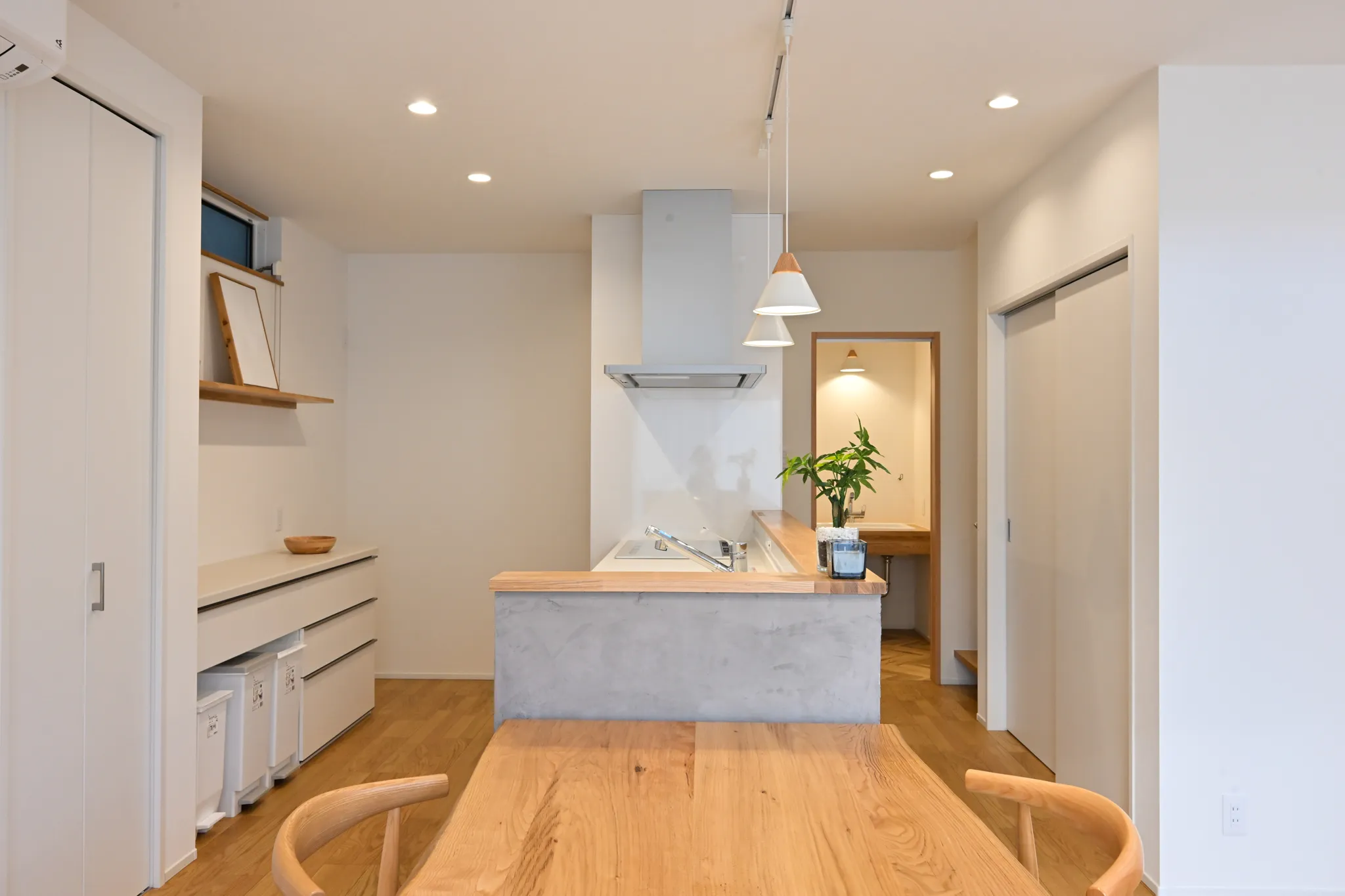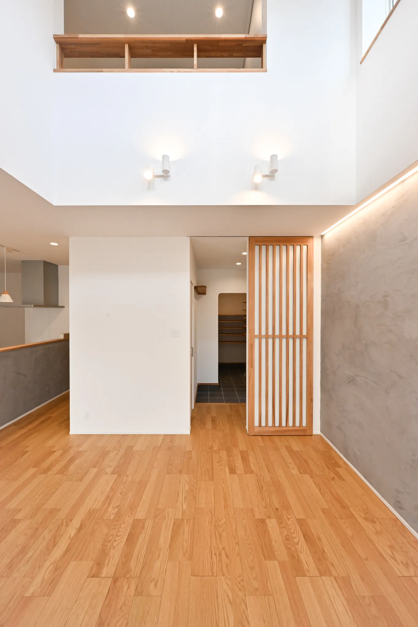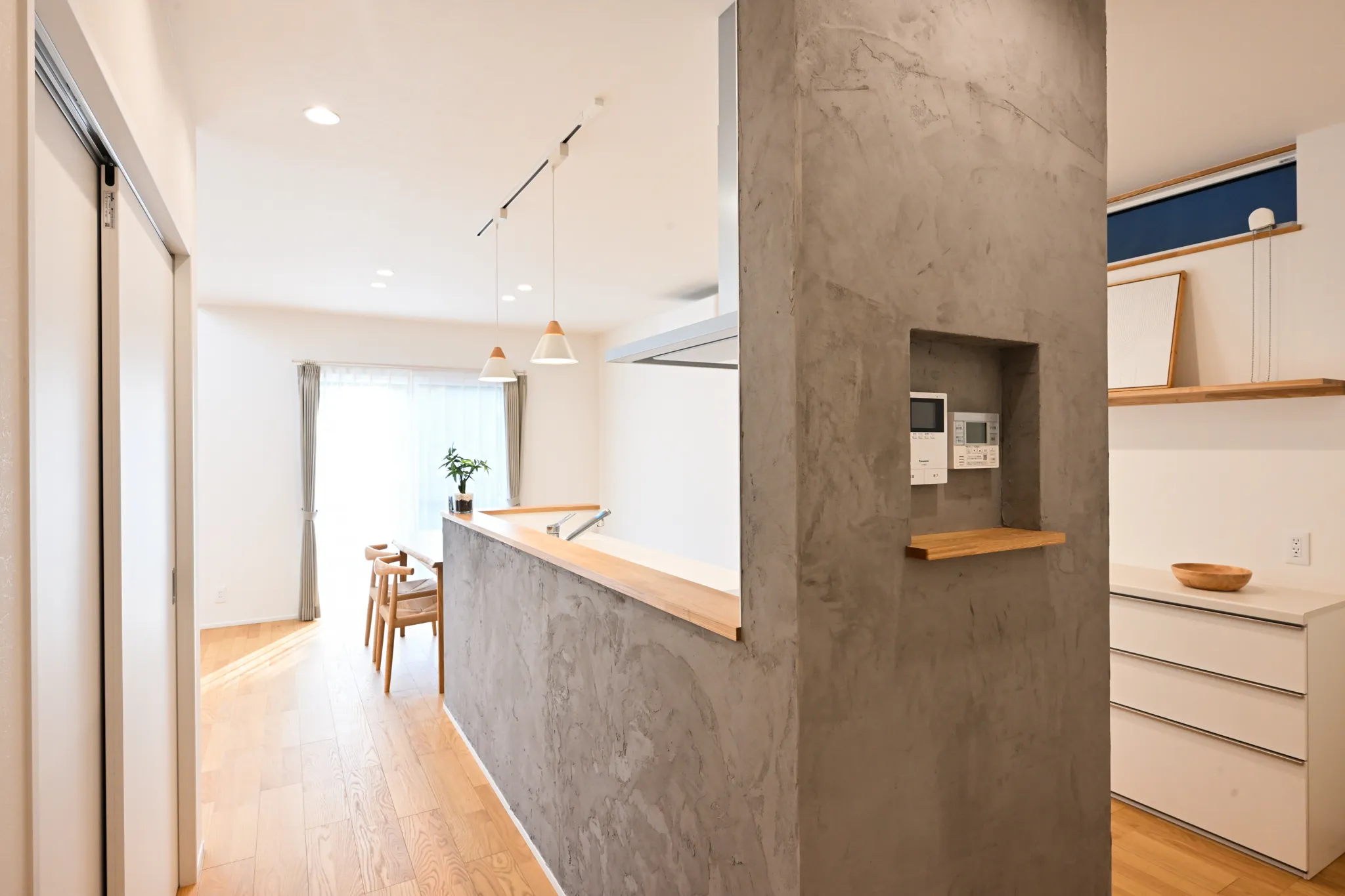 漆喰のアクセント壁や、木の質感を大切にした造作扉・枠材。