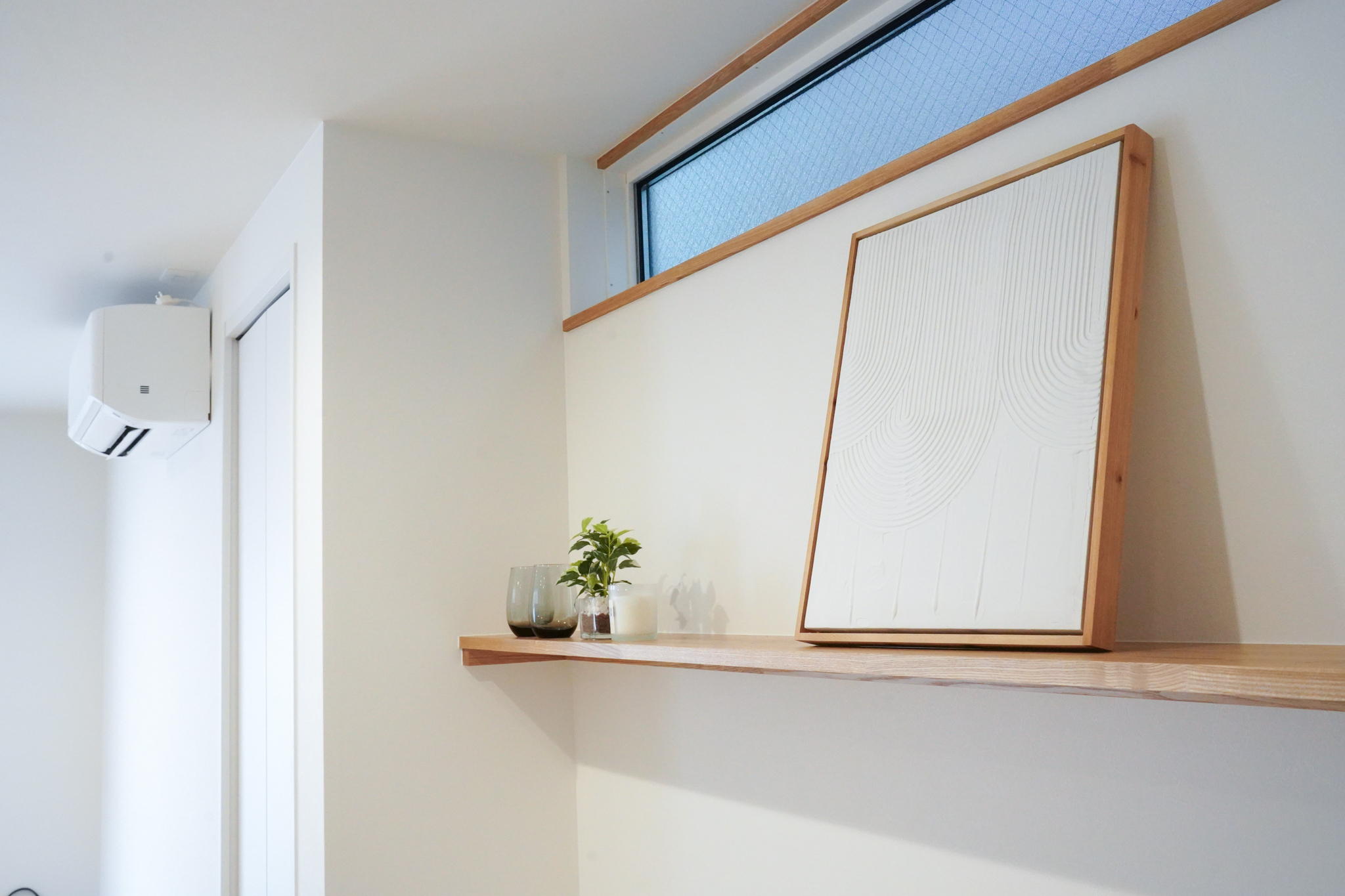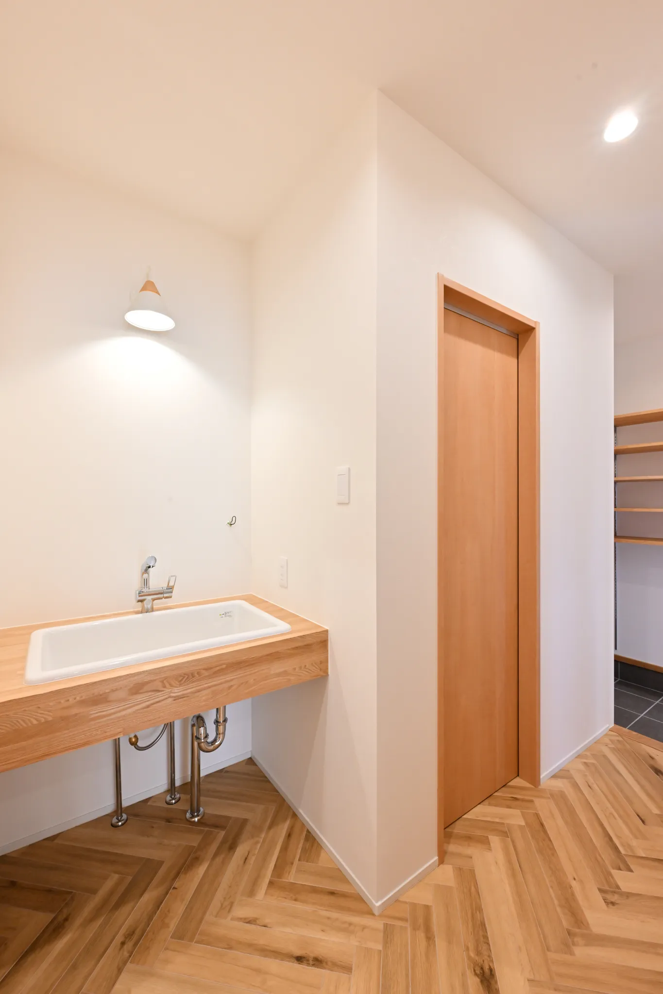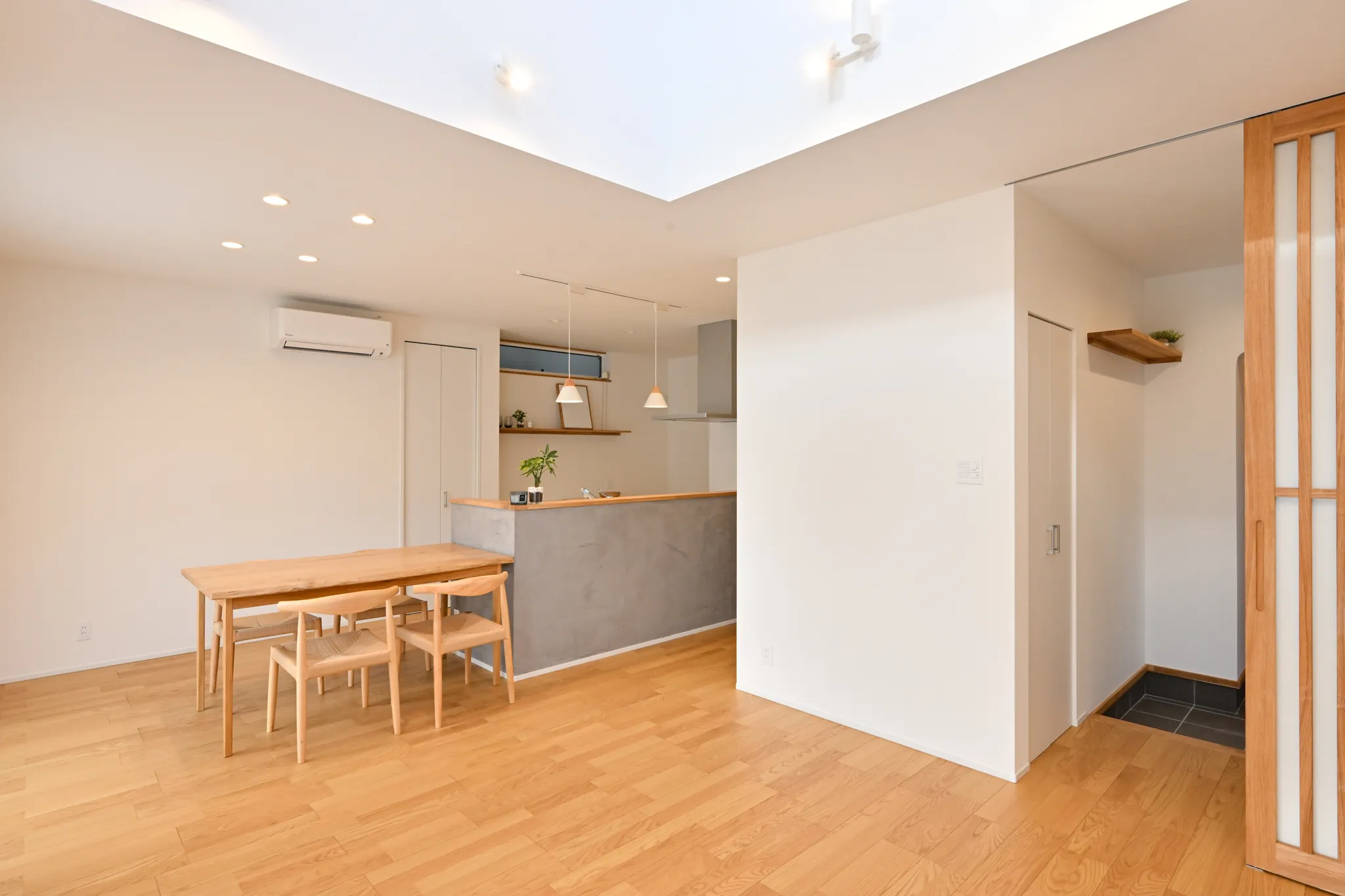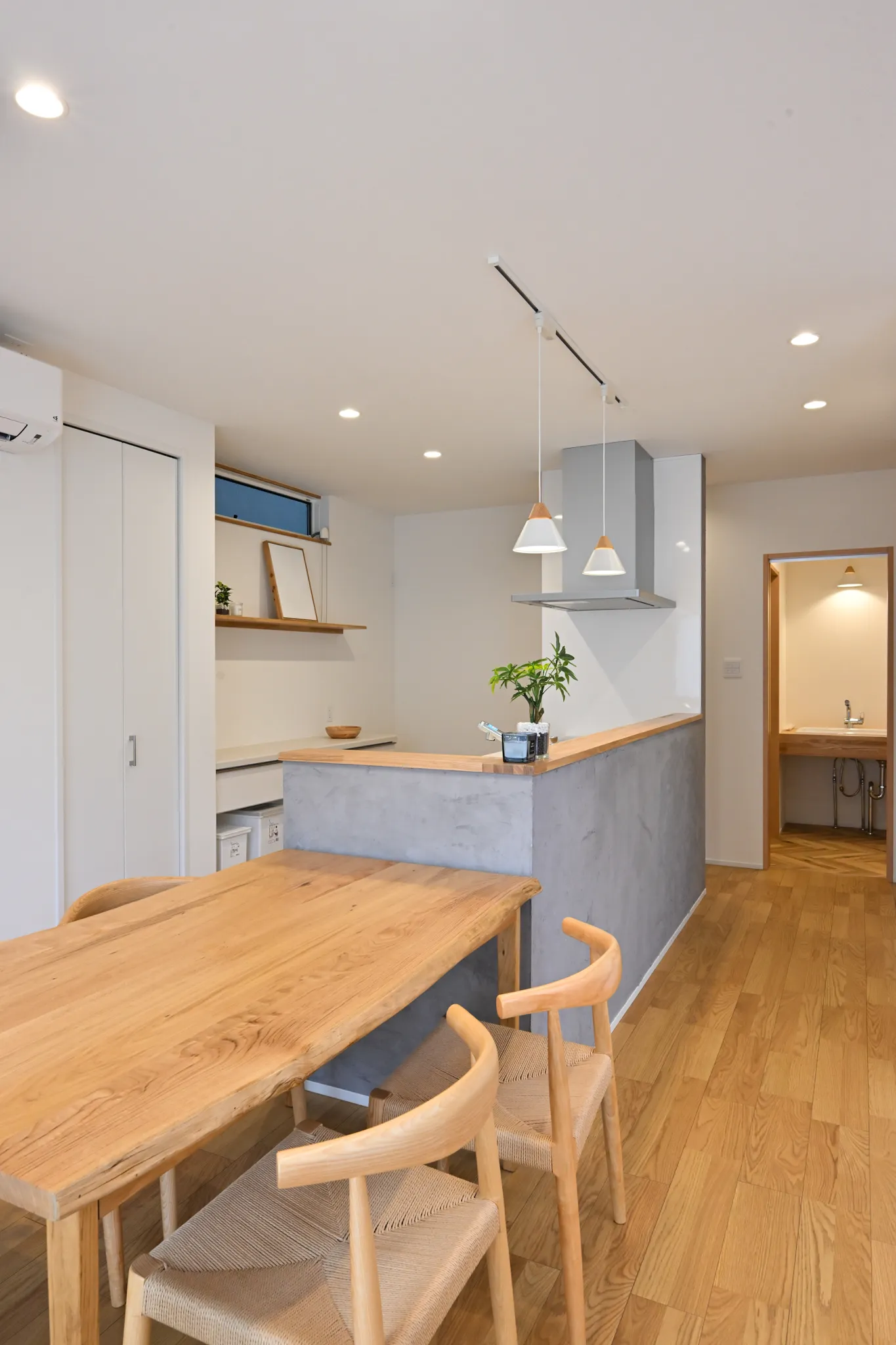 漆喰のアクセント壁や、木の質感を大切にした造作扉・枠材。