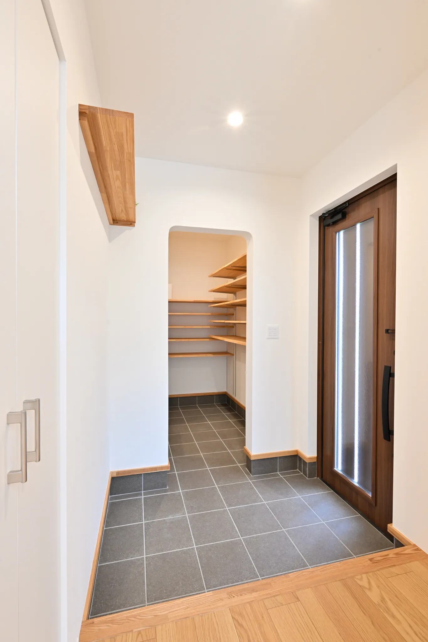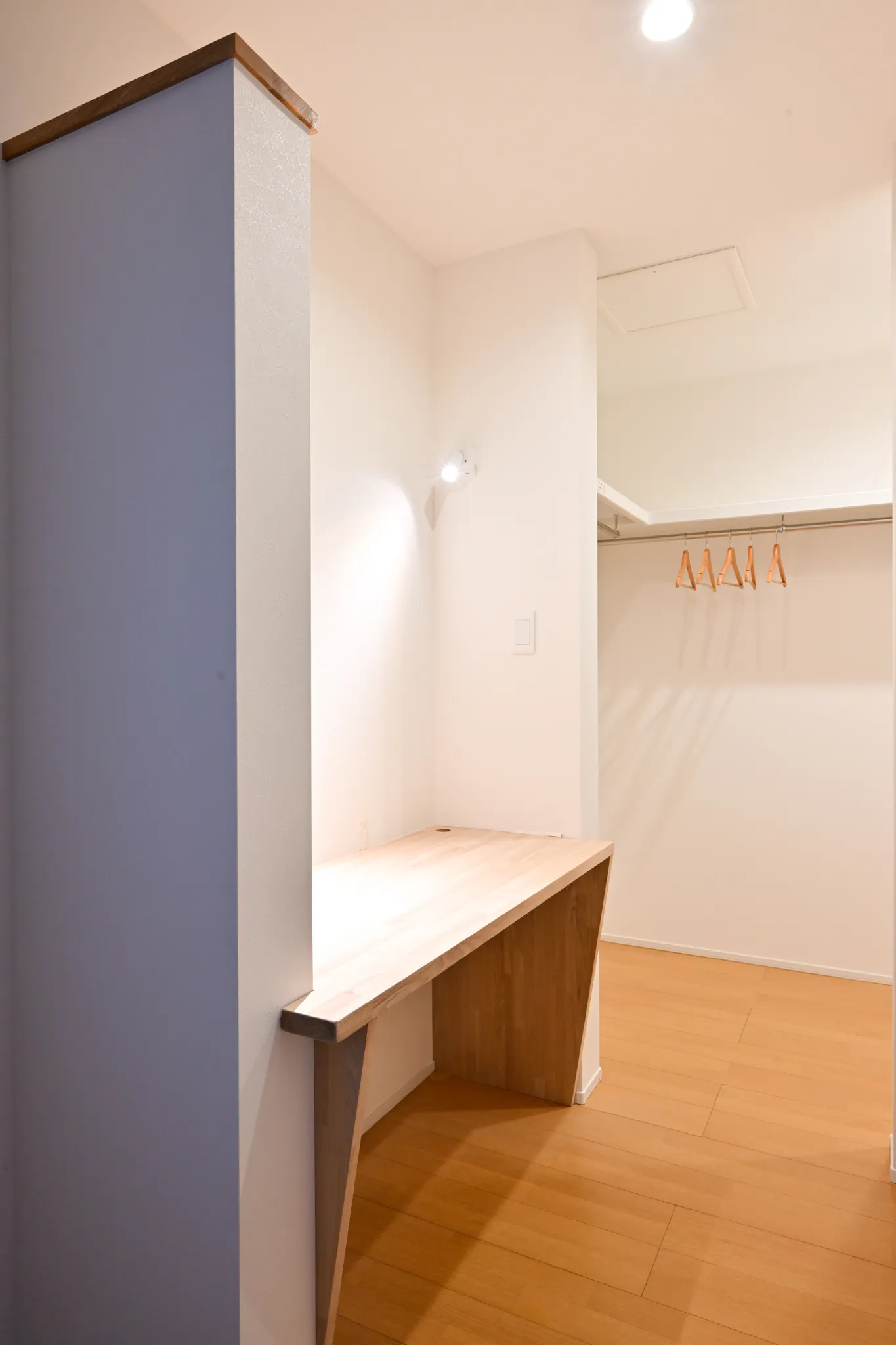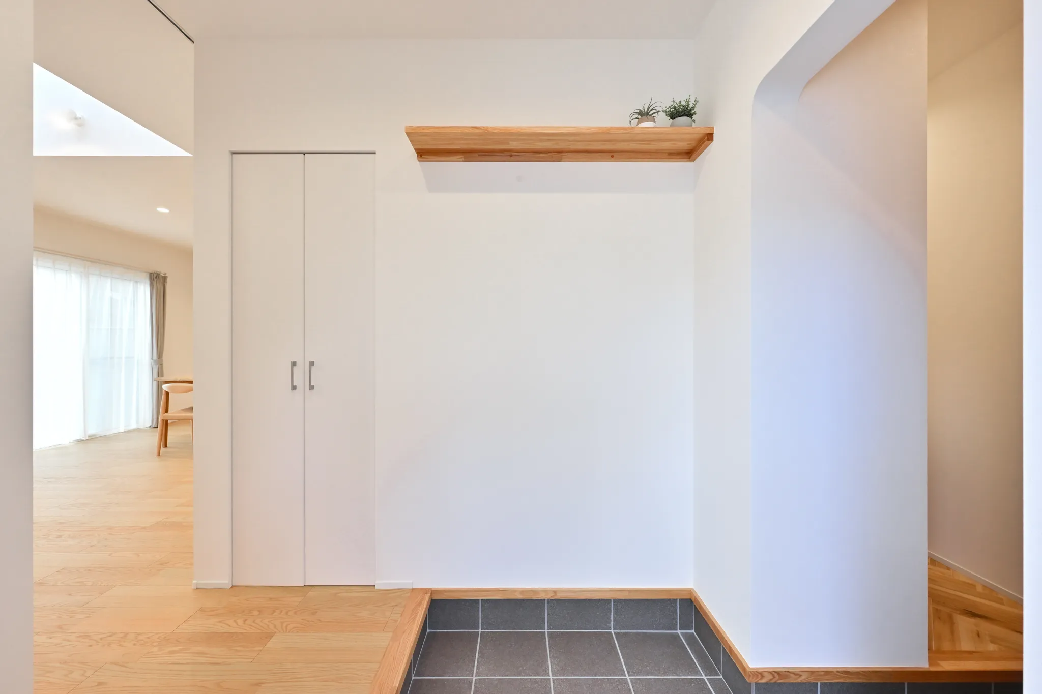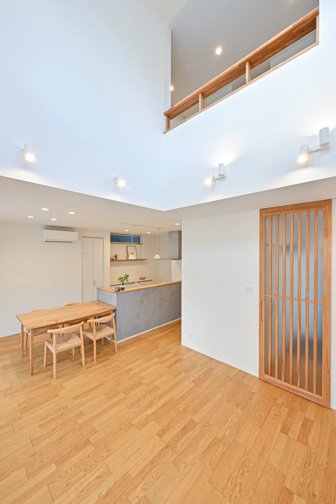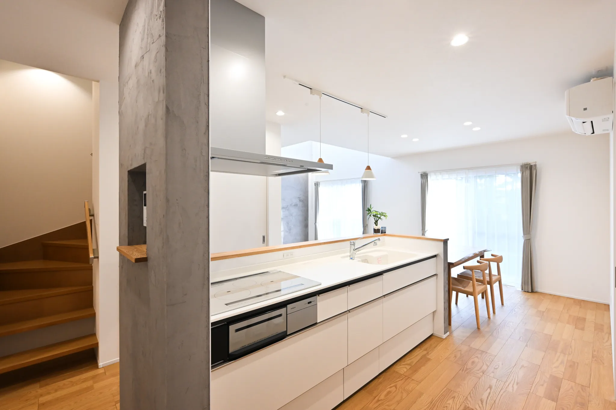 漆喰のアクセント壁や、木の質感を大切にした造作扉・枠材。