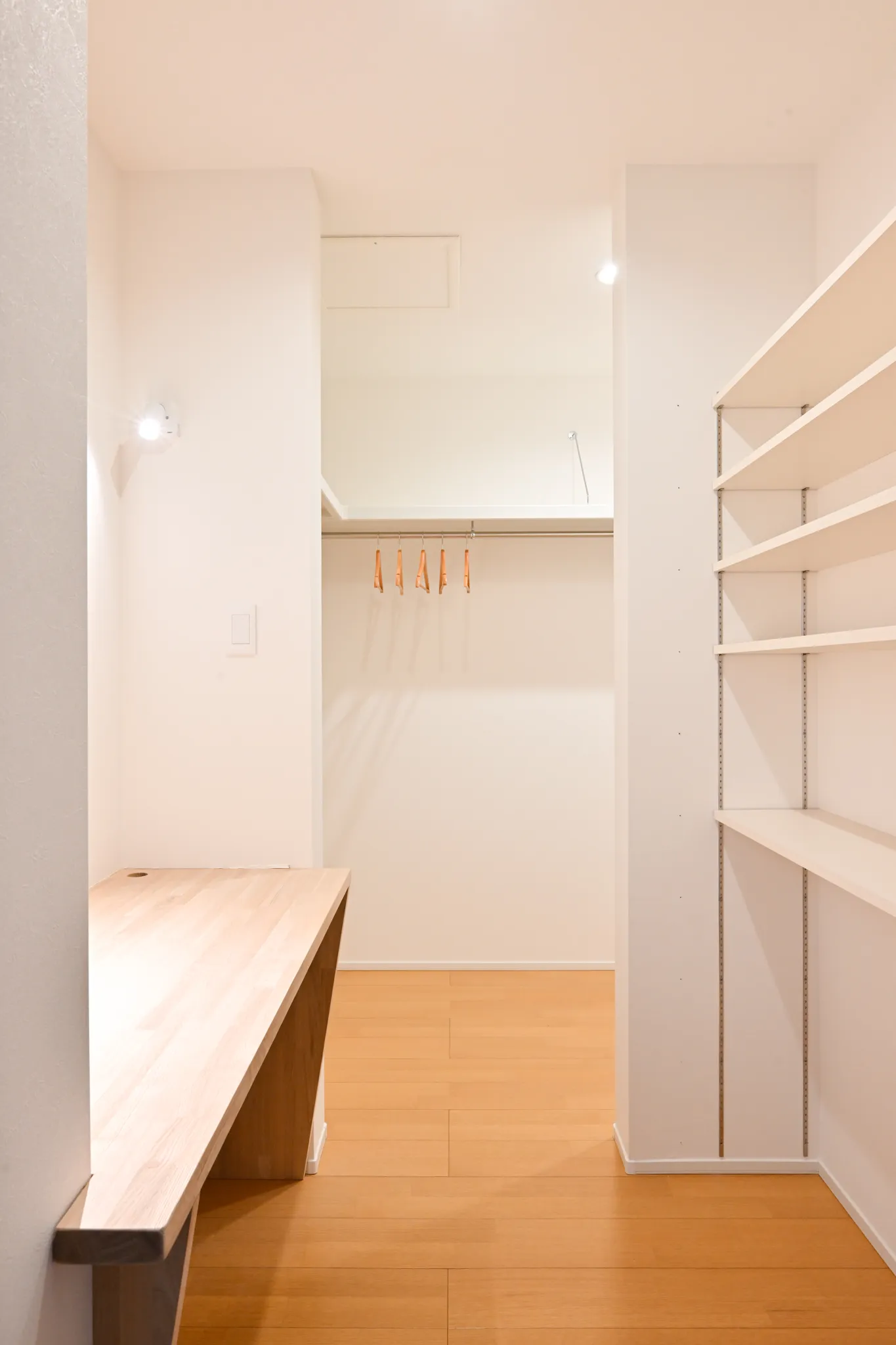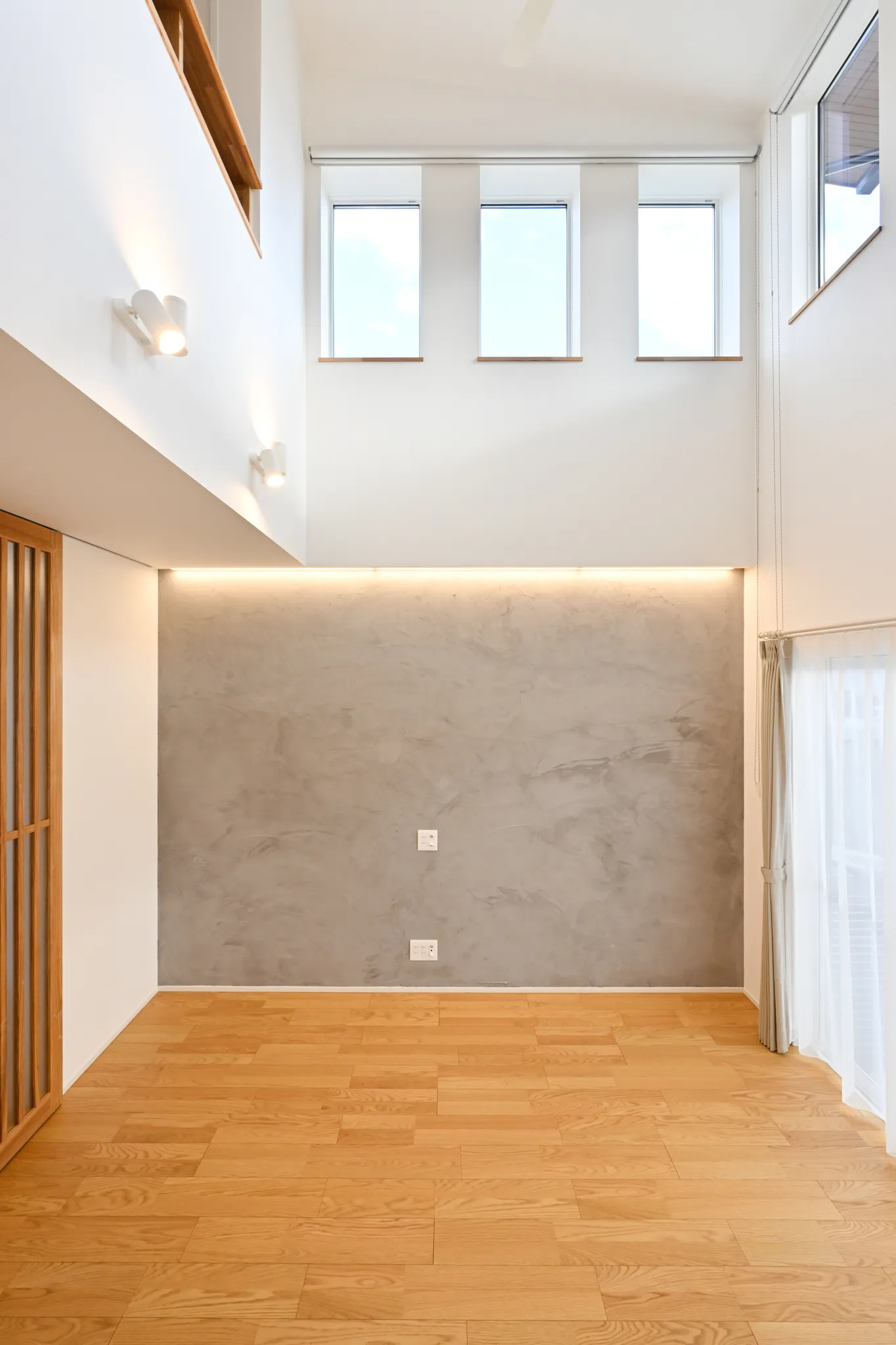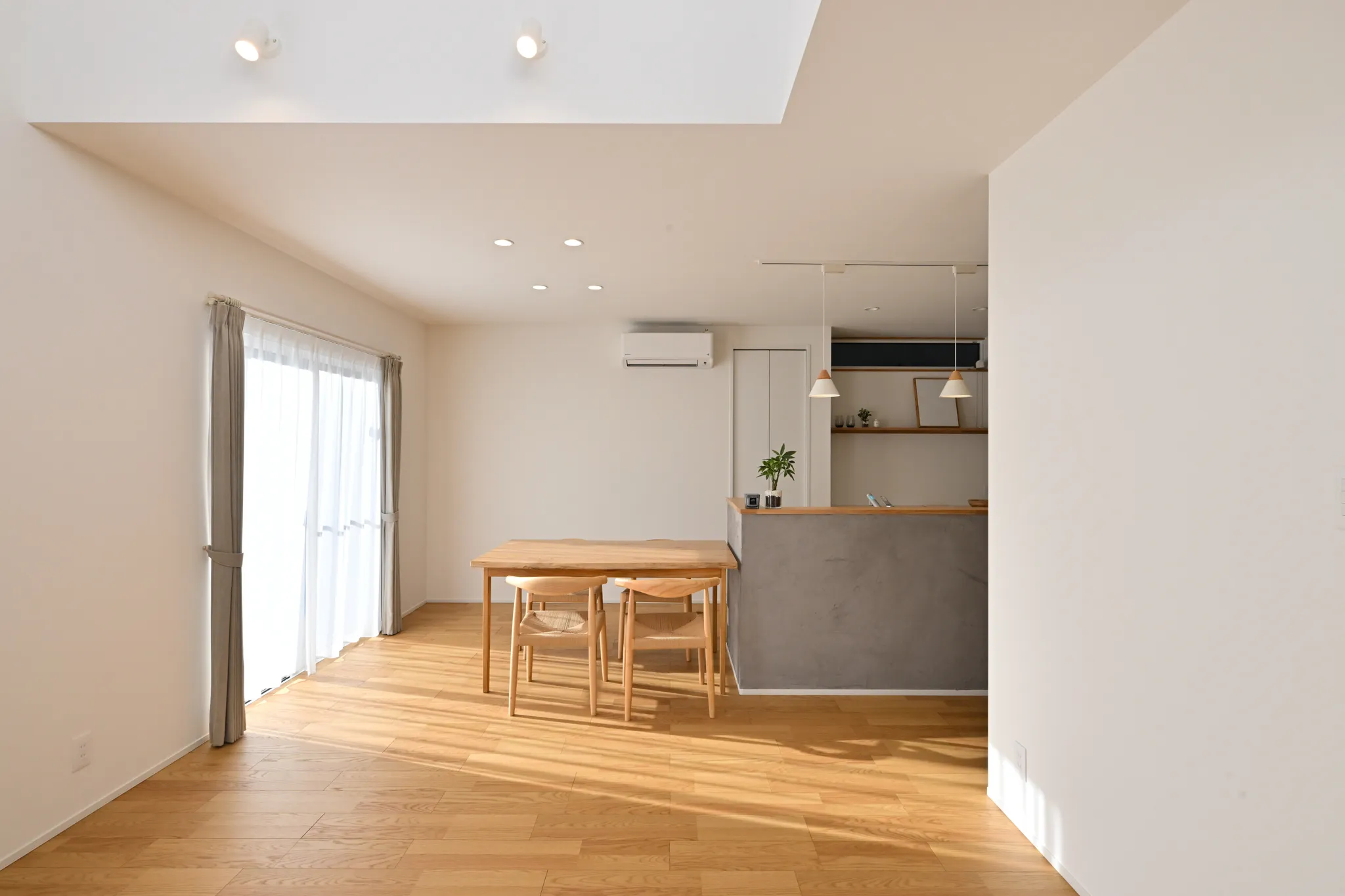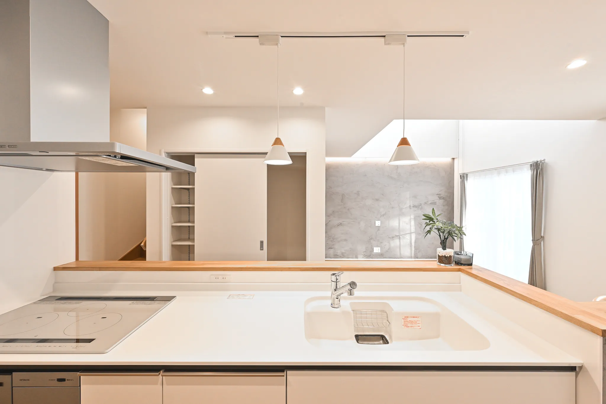 漆喰のアクセント壁や、木の質感を大切にした造作扉・枠材。