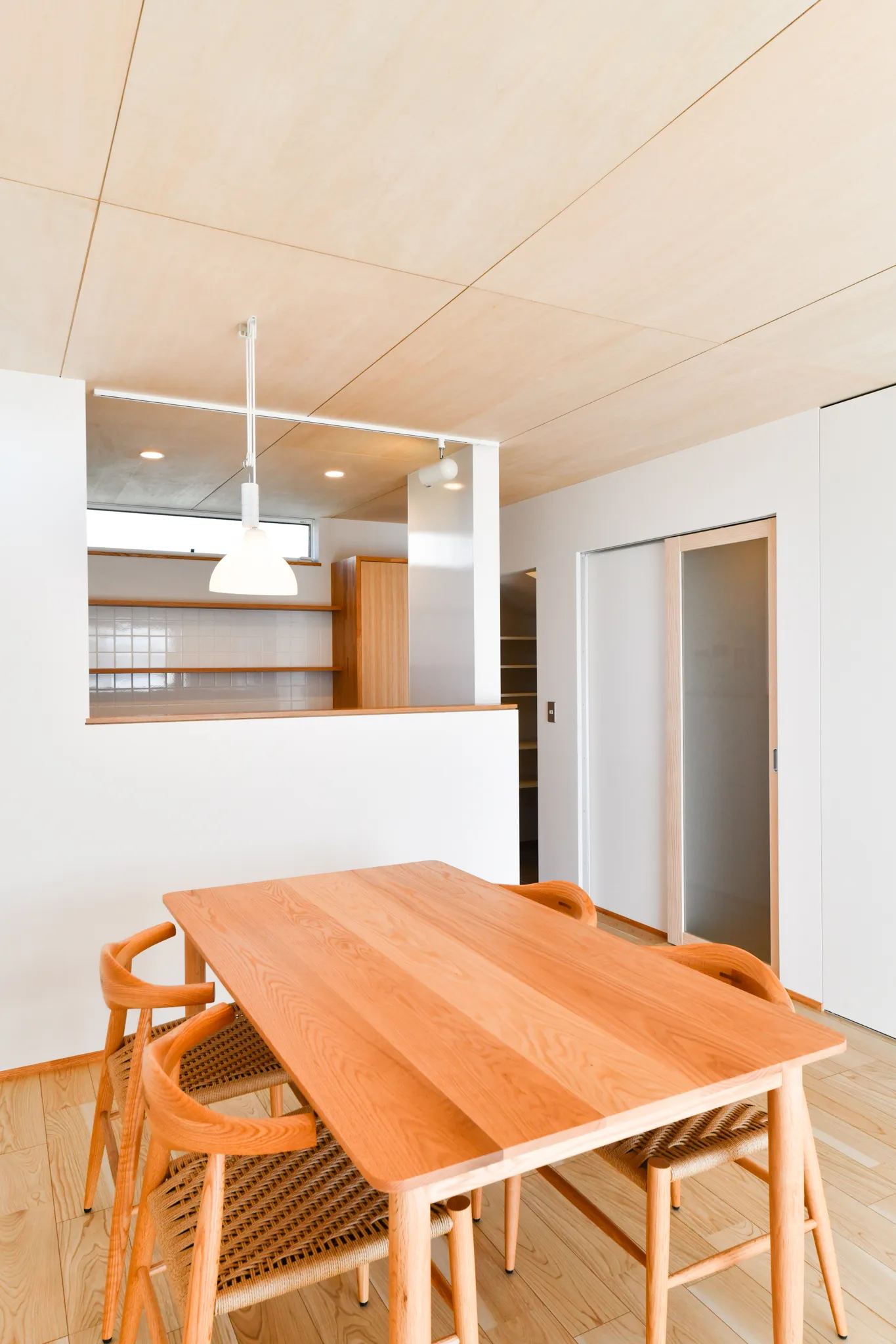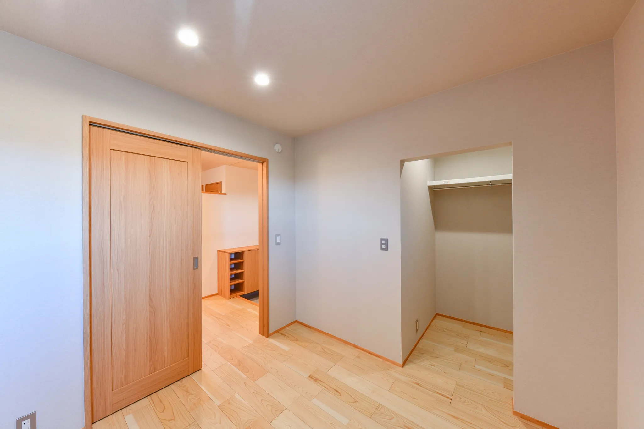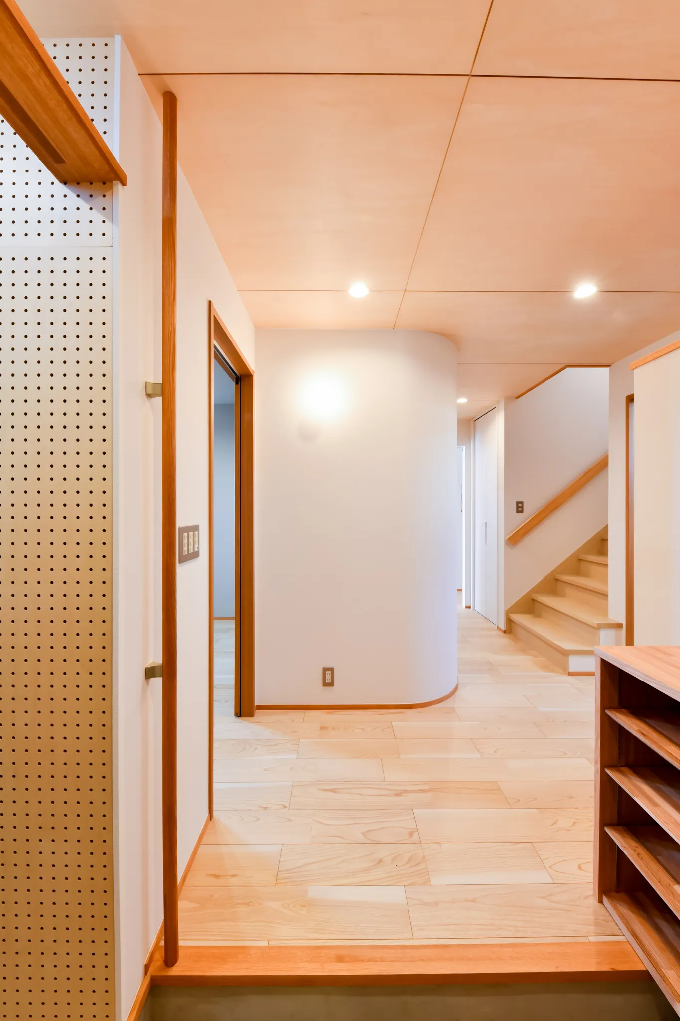 内装はレッドオークを基調に、ウッドワンの新モデル「WOシリーズ」の建具を取り入れ、造作と既製品を調和させています。