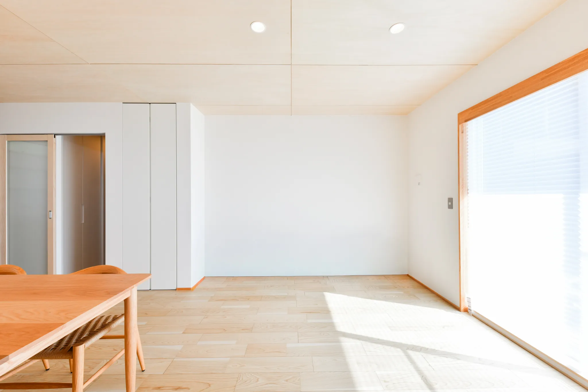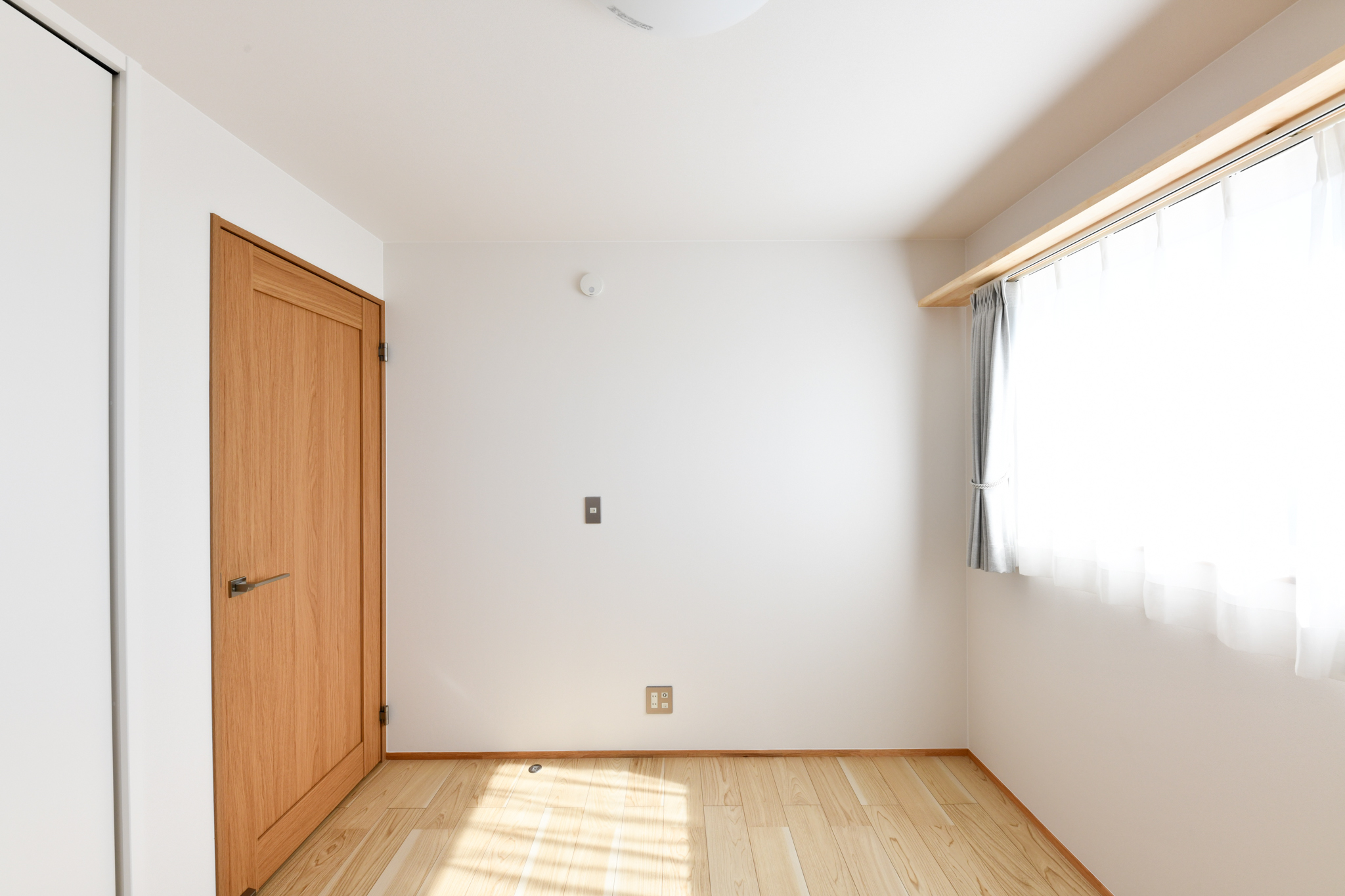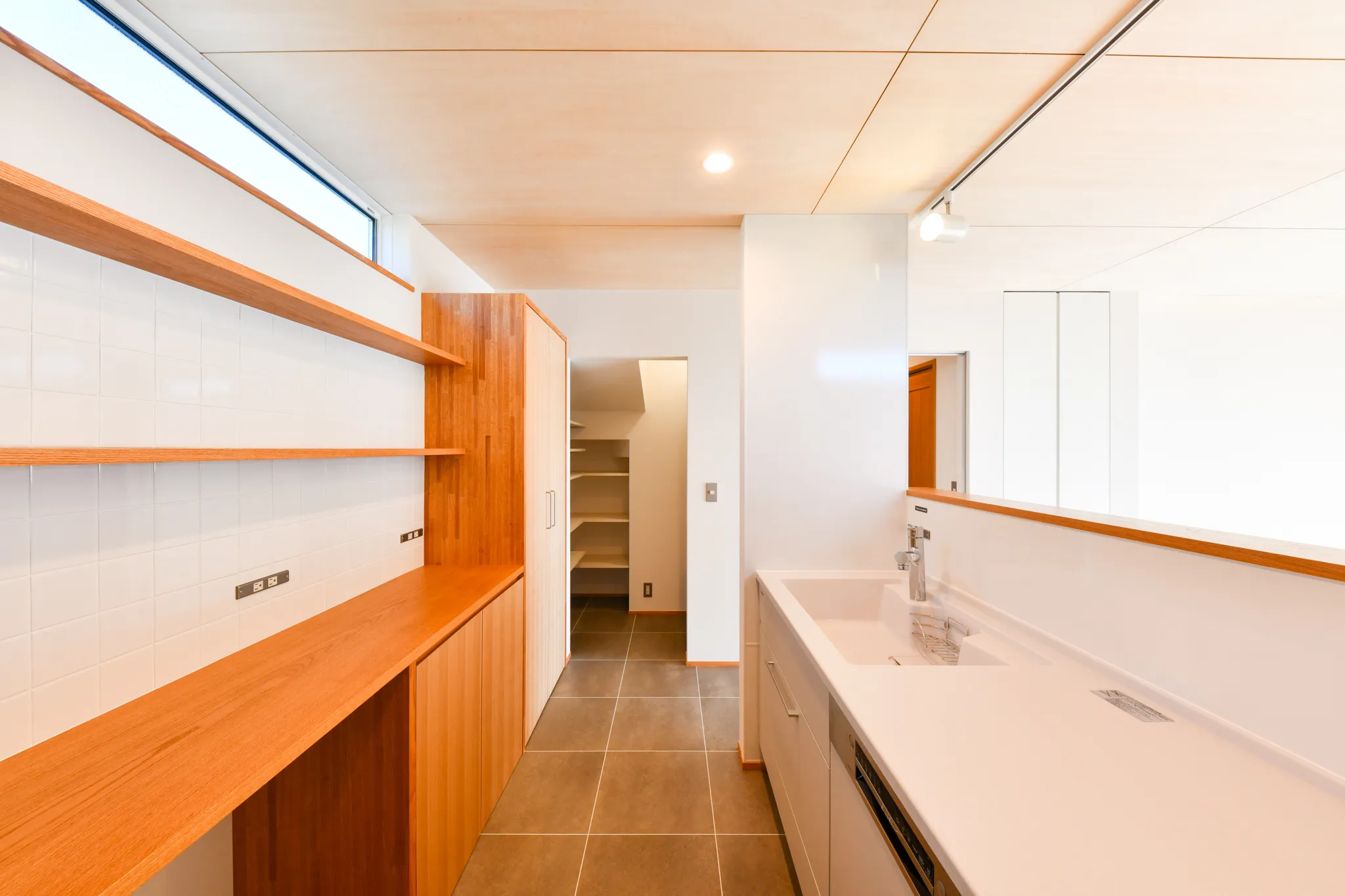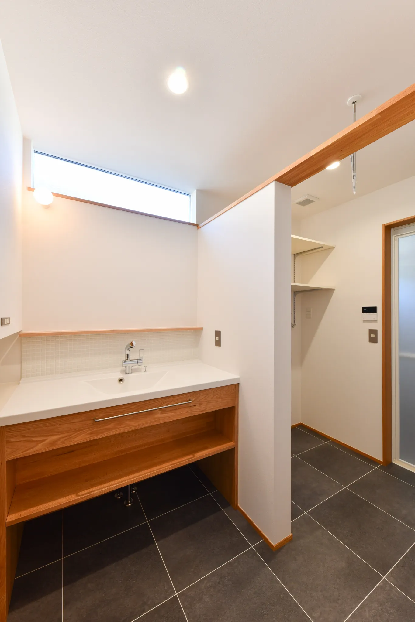 内装はレッドオークを基調に、ウッドワンの新モデル「WOシリーズ」の建具を取り入れ、造作と既製品を調和させています。