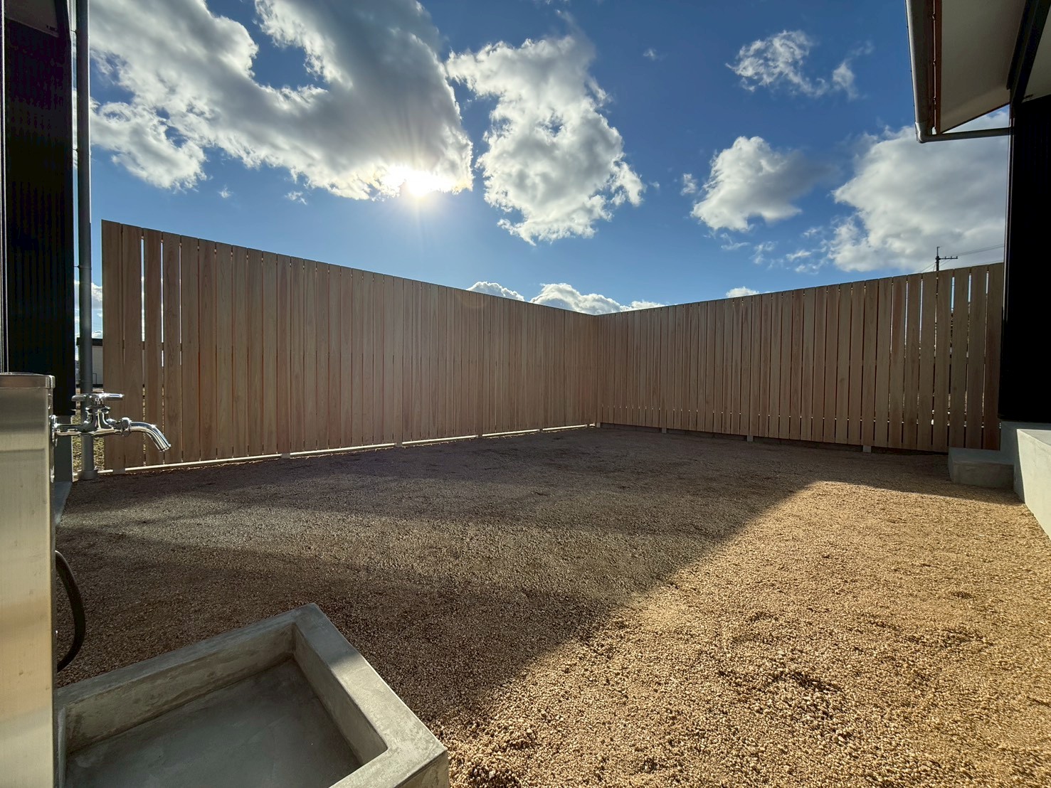 田んぼに接する境界には木製フェンスを設け、安心して過ごせるプライベート空間を確保しています。