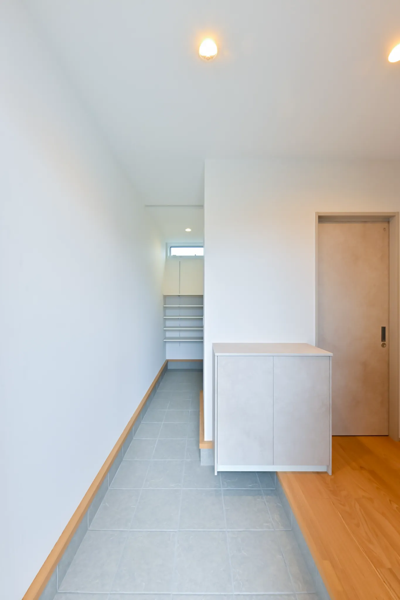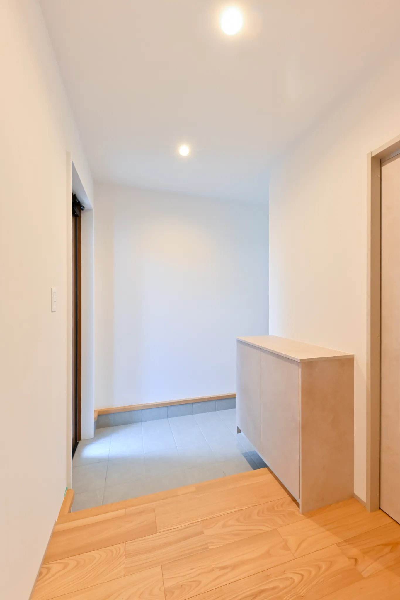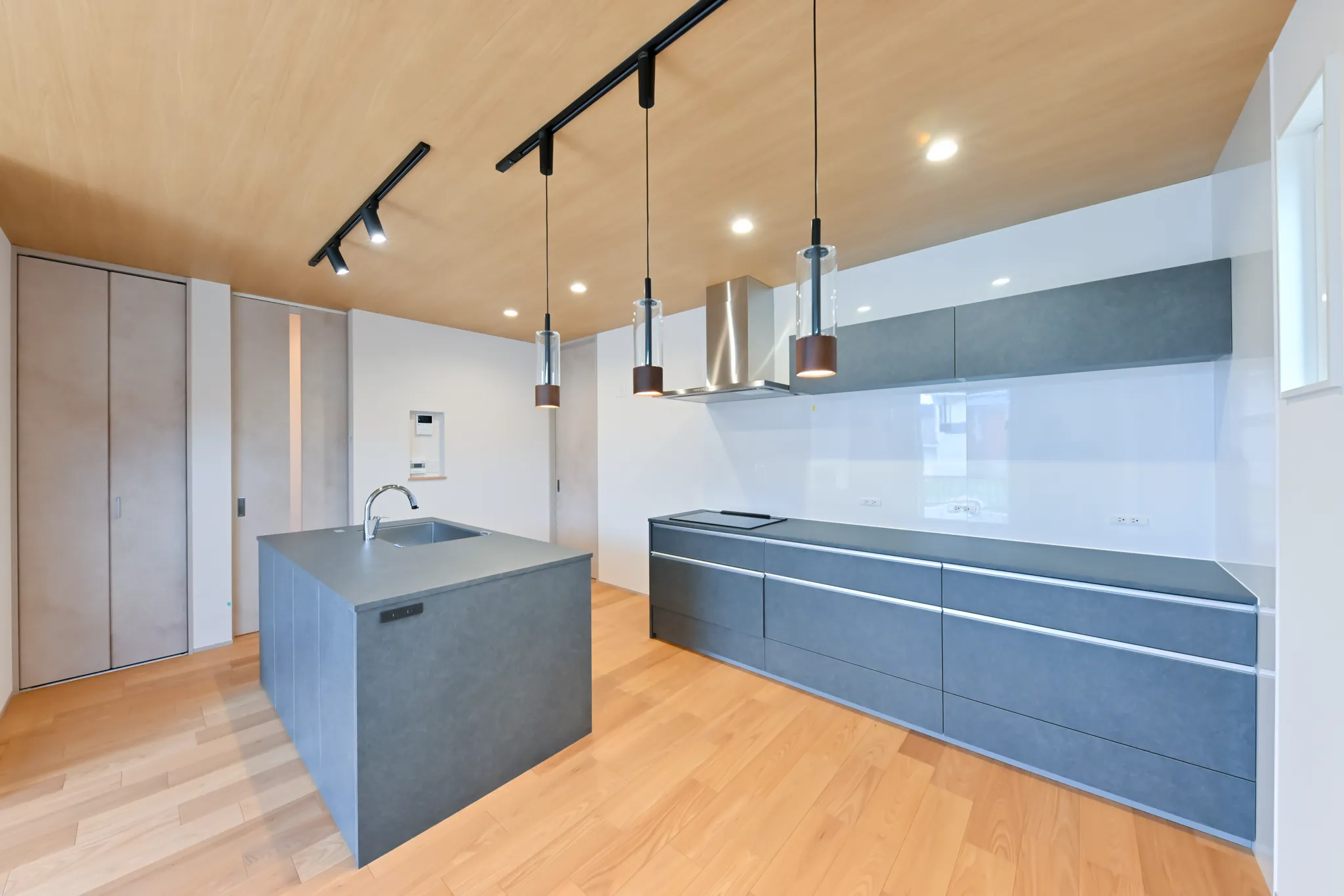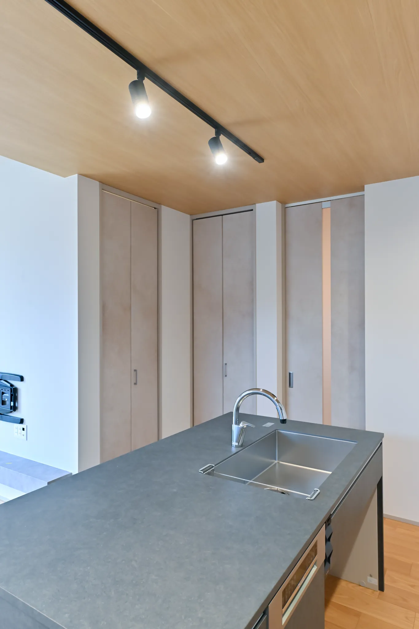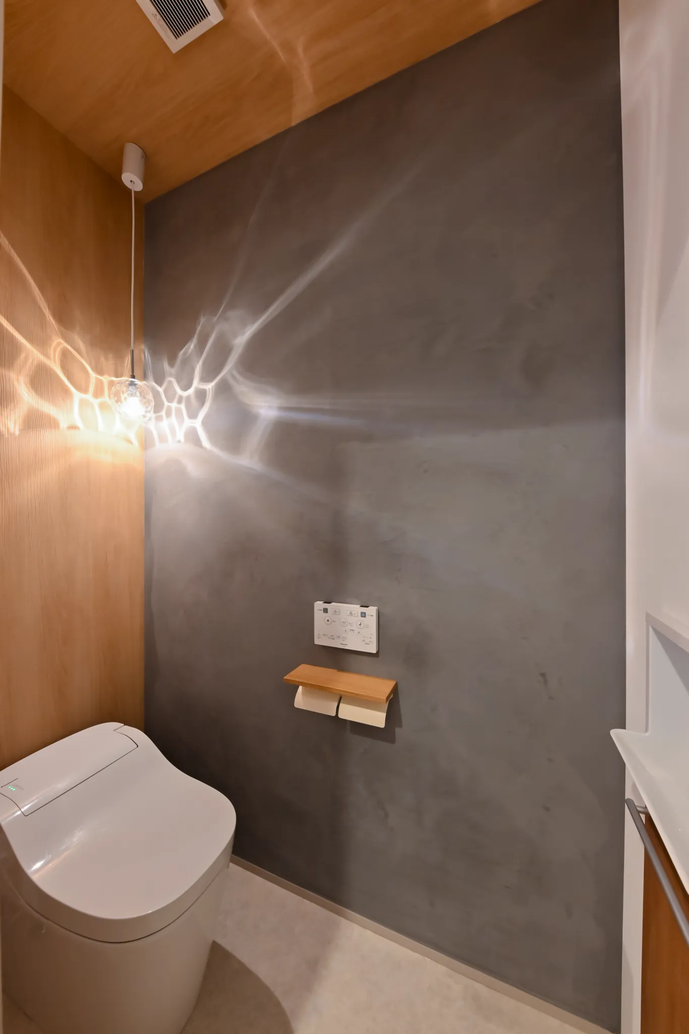 グレーの塗り壁ならではのマットな質感が空間をぐっと引き締め、木の天井や照明の光と合わさって、シックで印象的な空間を演出しています。